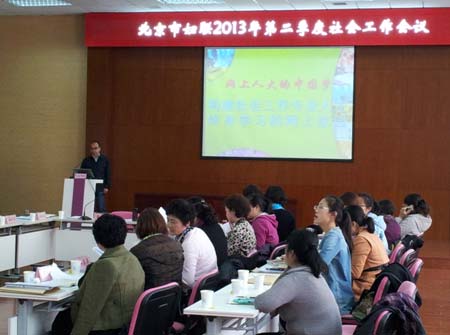 2013年4月12日上午,網(wǎng)上人大北京教學(xué)服務(wù)中心龔偉主任一行前往北京市婦聯(lián),借北京市婦聯(lián)社會工作會議之機(jī)向相關(guān)負(fù)責(zé)人員就市婦聯(lián)系統(tǒng)基層社工人才培養(yǎng)合作事宜進(jìn)行講解說明。北京市婦聯(lián)副主席趙麗君和北京市婦聯(lián)社會工作部部長陳延平和16區(qū)、縣負(fù)責(zé)同志出席。
