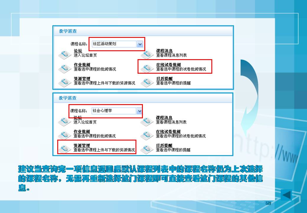 2011年下半年,網(wǎng)上人大緊跟最新技術(shù)發(fā)展的腳步,堅(jiān)持“以學(xué)習(xí)者為中心”的理念,經(jīng)過深入研發(fā)和不懈努力,建成了全新的教學(xué)平臺(tái)。平臺(tái)以“課程引領(lǐng)”+“自主學(xué)習(xí)”+“學(xué)習(xí)過程支持服務(wù)”為設(shè)計(jì)思想,改善了教師的教學(xué)過程和學(xué)生的學(xué)習(xí)過程,極大地推動(dòng)了網(wǎng)絡(luò)教學(xué)工作的開展。